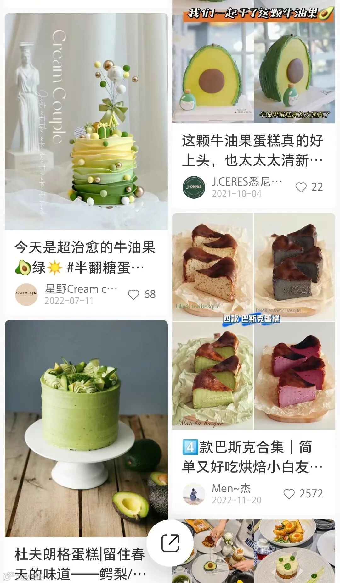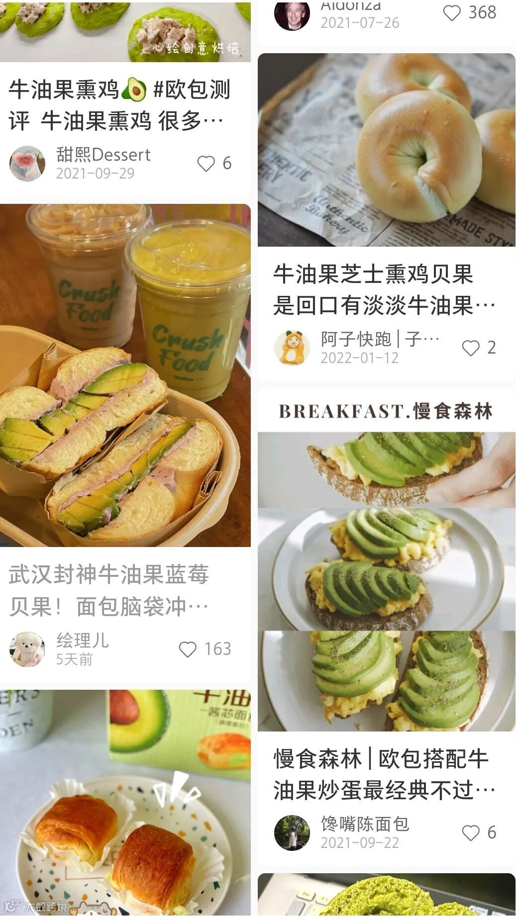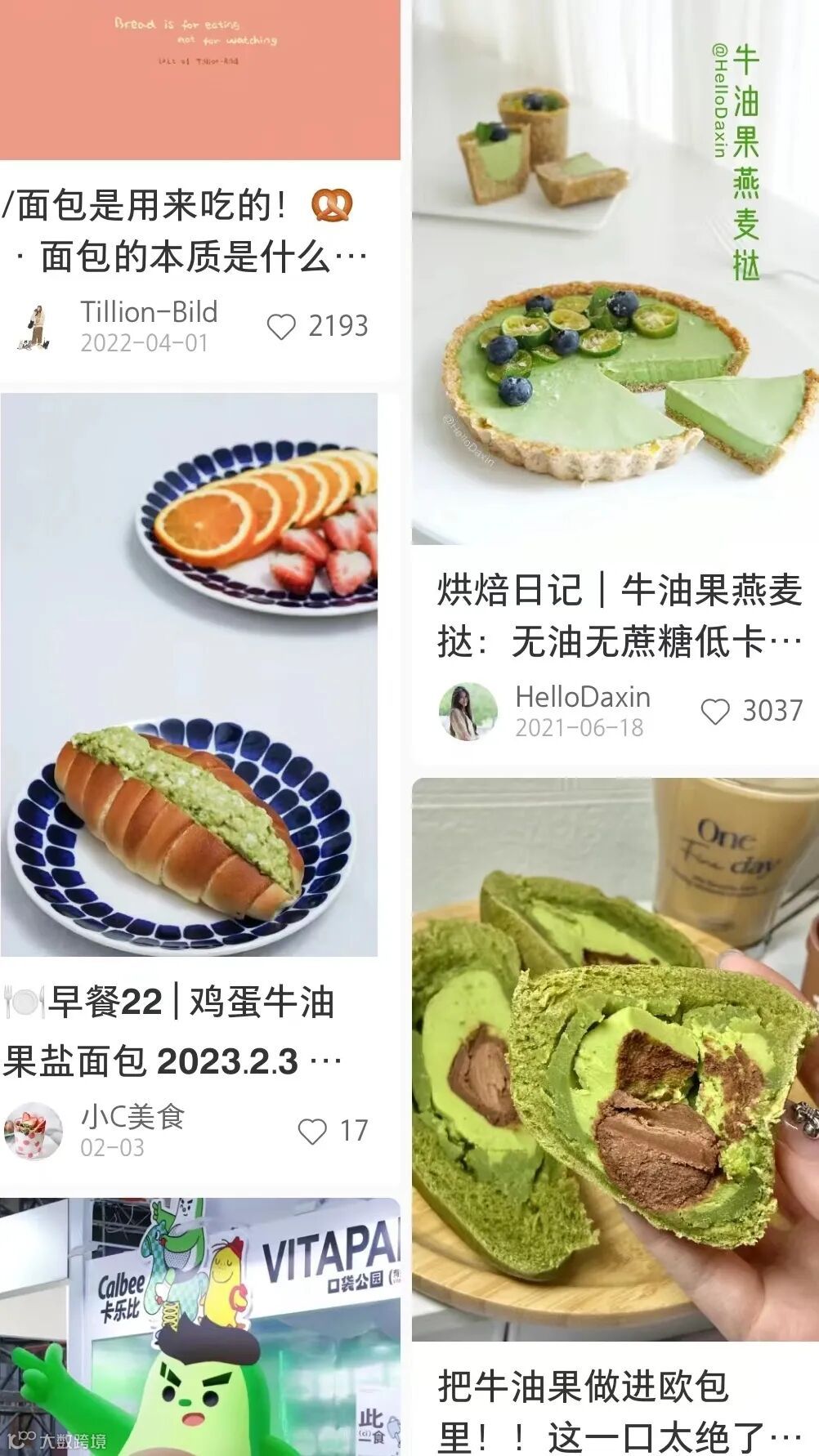 小红书上搜索#牛油果面包,会得到满满的干货与食谱。巴斯克、盘挞、贝果、欧包……数不胜数的烘焙产品。