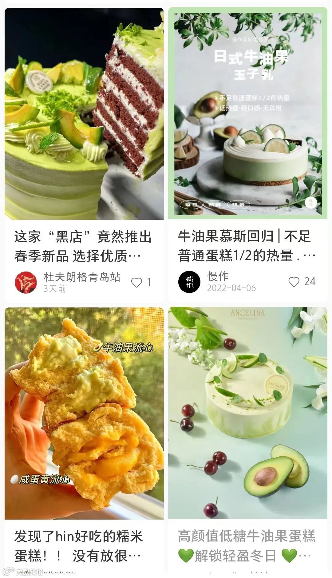 早在21年,牛油果就火过一波,不过很快就销声匿迹。星巴克已推出了牛油果抹茶蛋糕。现如今,许多品牌烘焙店也争相推出牛油果蛋糕。