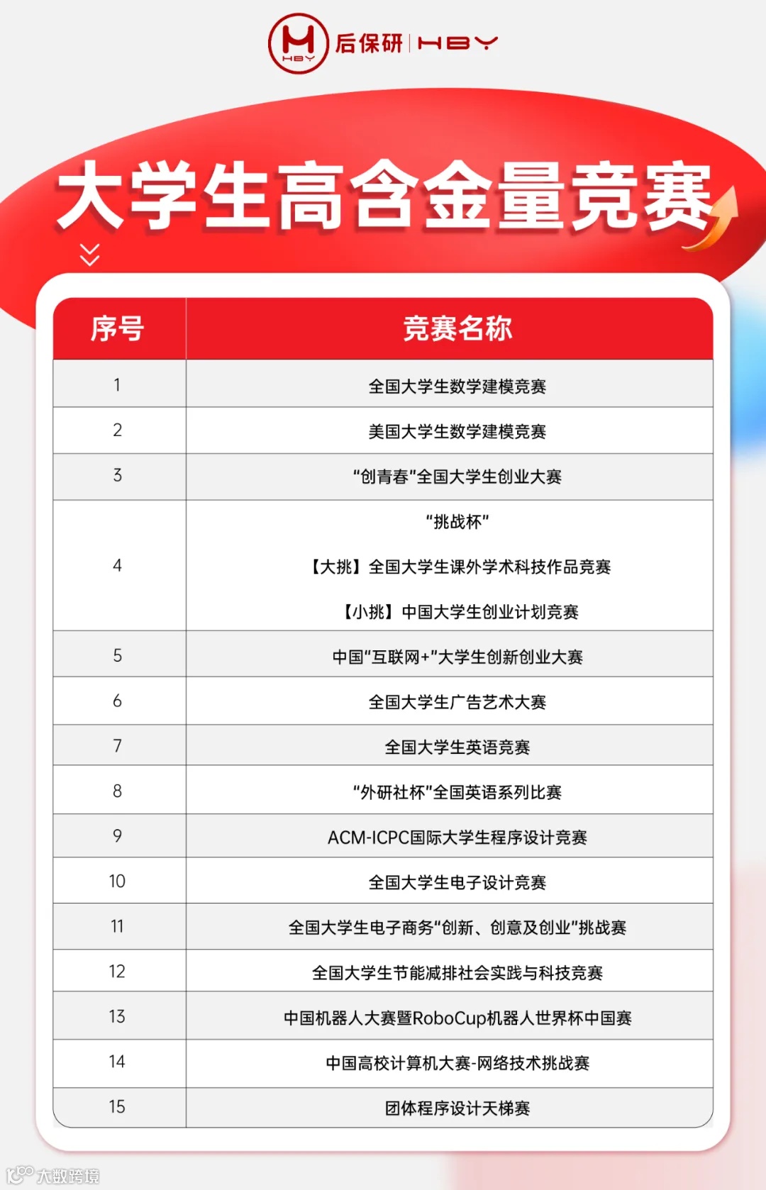 在这里主要为大家推荐“挑战杯”全国大学生课外学术科技作品竞赛、“挑战杯”全国大学生创业计划大赛、“互联网+”大学生创新创业大赛、数学建模美赛&国赛以及全国大学生英语竞赛、全国大学生广告艺术大赛等。在这些竞赛中获得的奖项会成为你在保研过程中极为重要的一个加分项,全国高校认可度都非常高,拿到高级别奖项甚至能弥补你在其他方面的劣势。