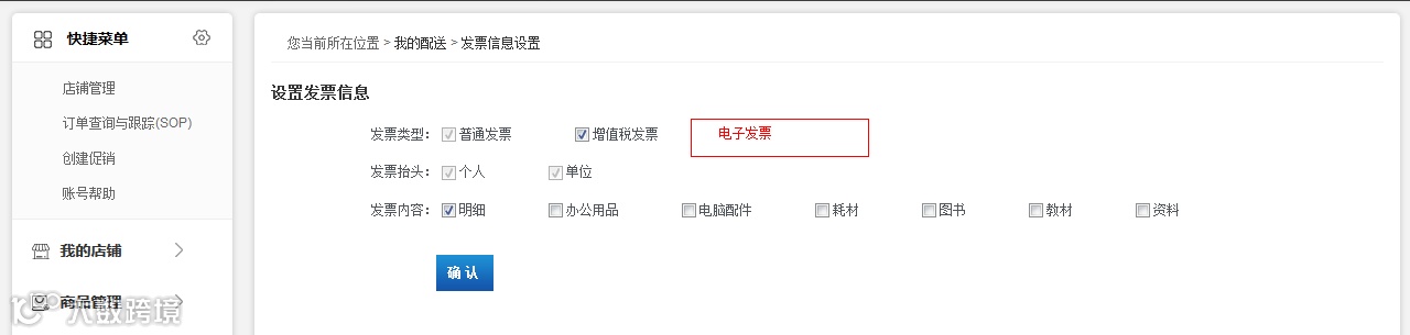 返回shop.jd.com,可以在“我的配送—发票信息设置”页面中设置电子发票开通的抬头和内容,保存后京东前台用户就可以在该商家店铺的商品的结算页面中让用户选择是否使用电子发票。