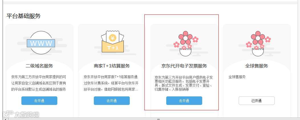 在商家后台店铺管理—商家服务中心页面的平台基础服务模块中的“京东电子发票服务”中点击去开通,页面跳转电子发票开通的流程页面完成开通的流程;