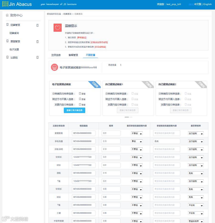该页面能查看到自己公司旗下店铺数量,但仅能配置自己店铺的发票参数,主要涉及【分类编码和税率信息】、【销货方与开票人信息】以及【发票内容分类信息】,点击设置,按照自己店铺三级类目具体情况进行配置。