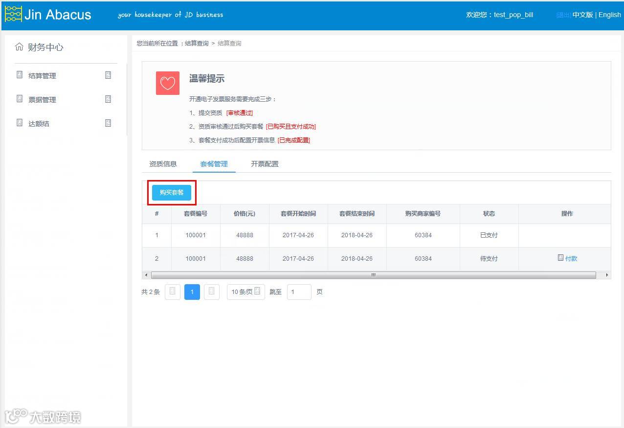 进入套餐管理页面,点击“购买套餐”(可多次购买),进入购买协议确认页,点击确认后会创建套餐购买申请单。点击“付款”可跳转至付款页面进行付款,付款成功后购买申请单状态会变更为“已支付”,然后可进入开票配置进行电子发票开具的相关参数配置;