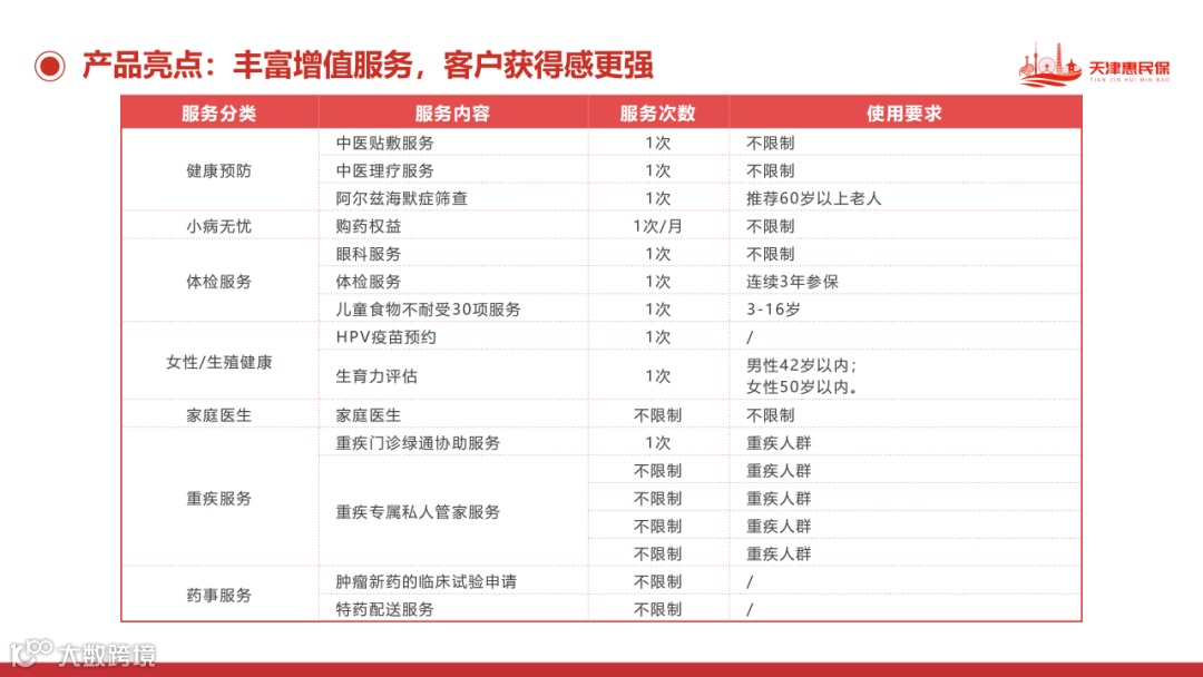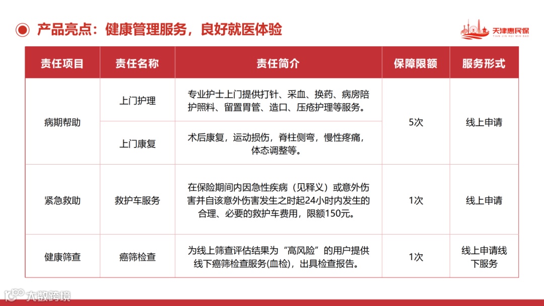 投保天津惠民保,除了能进行正常的医疗费用报销,还能享受到一些增值服务。比如中医贴敷、中医理疗、购药优惠等服务,健康人群也能用得上;还有上门康复、上门护理、救护车服务、癌症筛查等专属服务,全方位守护参保人的健康。