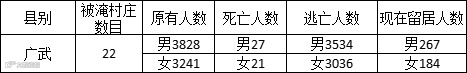 《河南战时调查损失报告》善后救济总署调查处,吕敬之,在报告中写到“自二十七年(1938)起豫省即一部沦入敌手,近年来旱灾、蝗灾、匪灾及黄河泛滥等灾相继而至,迄三十四年(1945)秋季止,全省一百一十县中无一县未受到敌寇侵扰,尤其是二十七年(1938)的黄泛与三十一年(1942)之旱灾,全省被毙饿死者几达三百万人,其中祸之重,实为全国所罕见。”这也许就是广武县人口减少主要原因的概括总结。虽然把人为因素说的有点模糊,都归结到客观方面,但是老百姓都是心知肚明的。