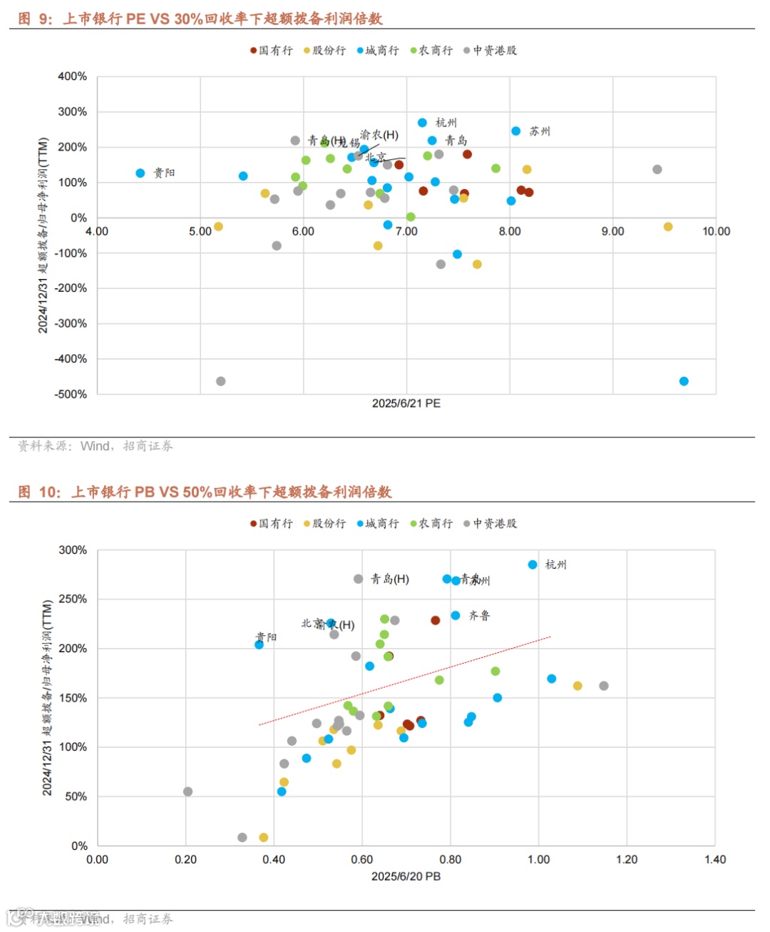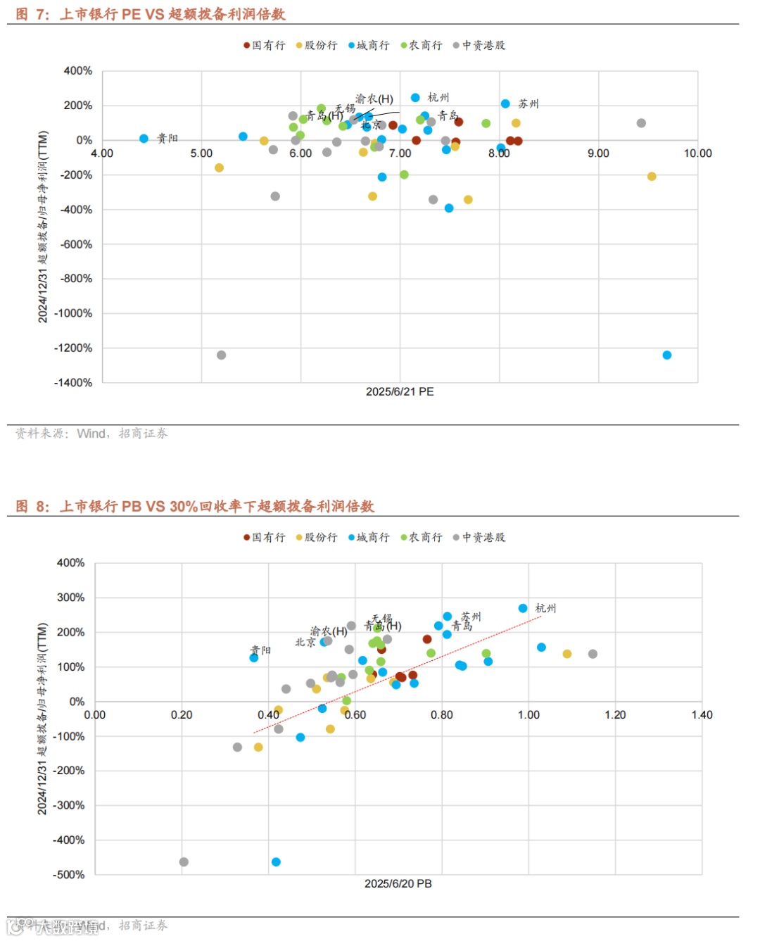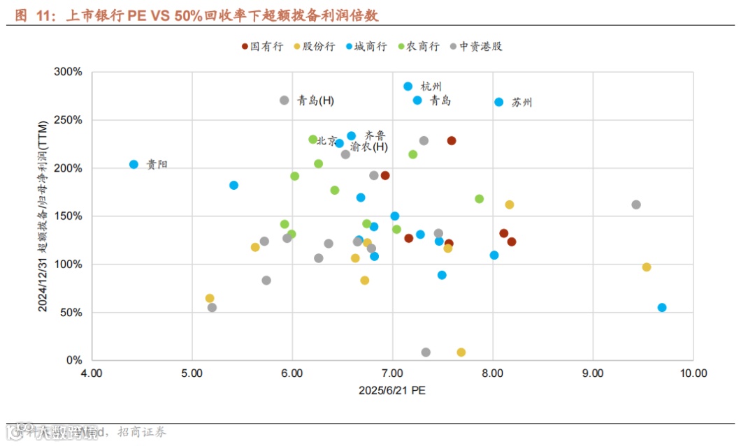 从估值角度看,银行PB、PE与ROE及超额拨备水平相关性较高[k]。部分银行如无锡银行、苏州银行、张家港行、农业银行以及贵阳银行、北京银行、光大银行、渝农商行(H股)、青岛银行(H股)等位于PB-超额拨备利润倍数回归线上方,可能存在估值修复机会[k]。
