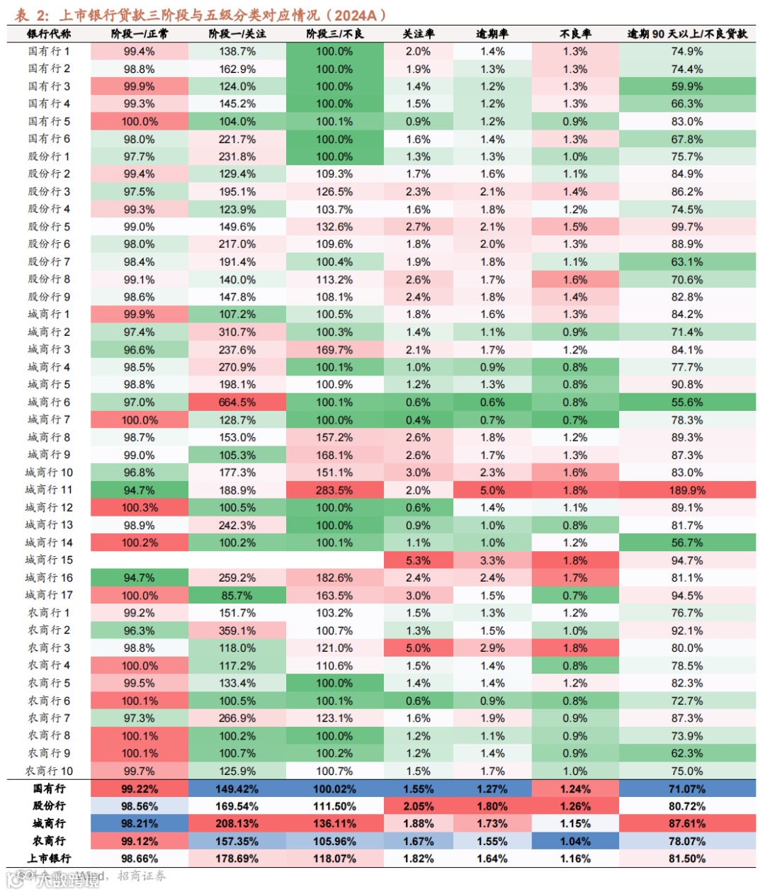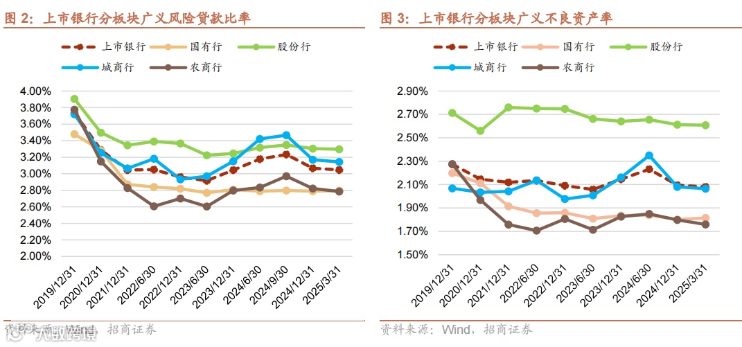 广义风险贷款额取“逾期贷款+重组贷款”与“关注贷款+不良贷款”两者较大值,广义风险贷款率=广义风险贷款额/总贷款额[k]。非信贷资产风险则以“金融投资及同业资产中第三阶段规模”占比衡量[k]。最终,银行广义不良资产率=(广义风险贷款额+非信贷资产第三阶段)/总生息资产[k]。数据显示,国有大行该比率相对平稳,股份行和城商行偏高,农商行呈改善趋势[k]。