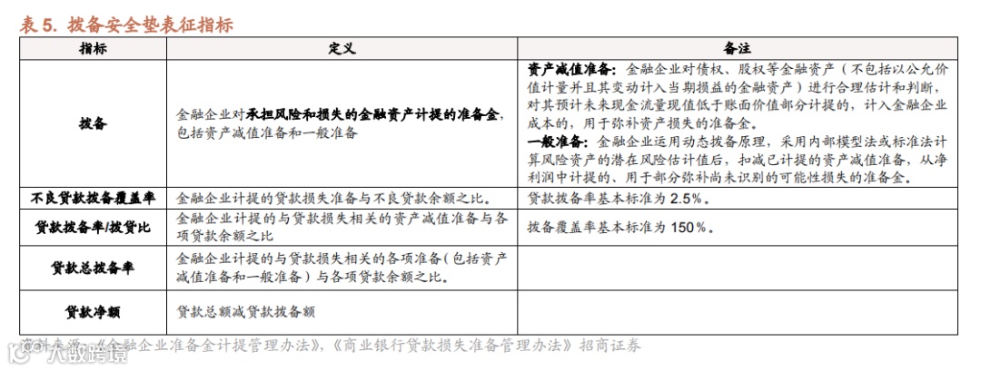 拨备安全垫主要通过拨备覆盖率和拨贷比衡量[k]。前者为贷款损失准备与不良贷款余额之比,监管基本标准为150%;后者为贷款损失准备与各项贷款余额之比,标准为2.5%[k]。贷款净额等于贷款总额减拨备额。但这两项指标仅覆盖贷款,未包含债券、同业资产等非信贷资产,难以全面反映银行真实风险敞口[k]。