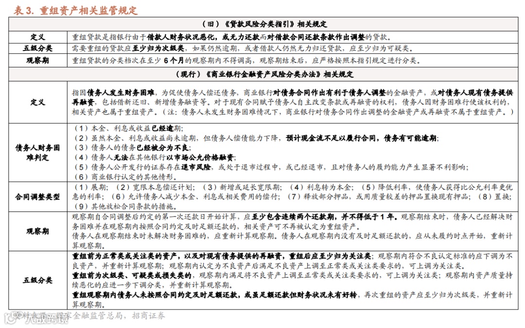 逾期和重组是反映资产质量变化的重要行为指标[k]。根据新规,金融资产逾期后至少归为关注类,超90天、270天、360天分别至少归为次级、可疑、损失类,首次确立90天为不良认定底线[k]。重组资产指因债务人财务困难,银行对其合同条款作出有利调整的金融资产,新规延长重组观察期至至少1年,并要求重组资产至少归为关注类,若重组前已属不良,则至少归为次级类[k]。重组与逾期虽有关联,但重合度不高[k]。