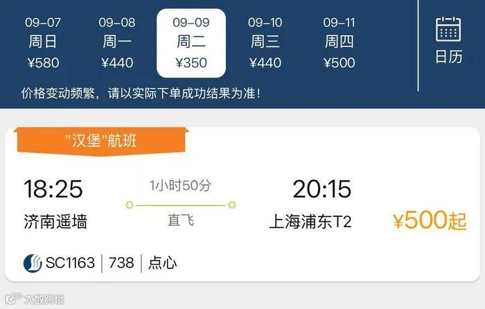 有记者通过山东航空微信小程序查询发现,在济南遥墙机场飞往上海虹桥机场的航班列表中,确实可以看到醒目的 “汉堡航班”标签,方便旅客识别和选择。
