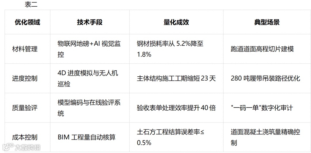 中国交通建设集团有限公司的鄂州机场项目为亚洲首个在全生命周期应用建筑信息模型(BIM)的航空枢纽,其 5D 管理平台达成了“建模 - 施工 - 验评 - 计量”全流程的数字化闭环。该项目运用场道切片建模技术处理了 800 万个构件,关键效益指标如表二: