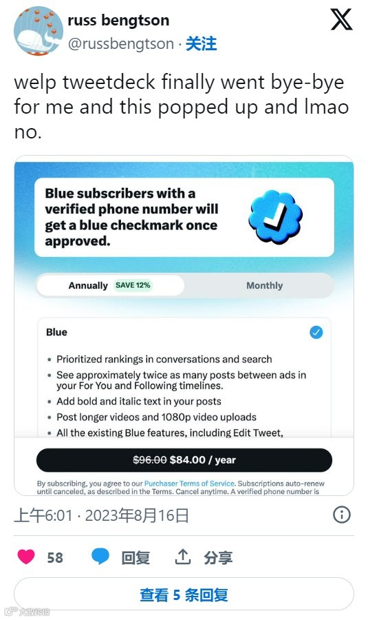 一些用户在该平台上指出,在尝试访问 TweetDeck 时,他们会看到一个弹出窗口,提示他们购买 Blue 订阅。