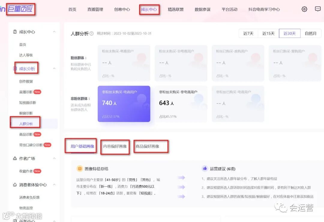 当然如果我们是达人,选品时也要看看我们的账号的人群画像:用户基础画像、内容偏好画像、商品偏好画像。登录巨量百应平台-成长中心-成长分析-人群分析。