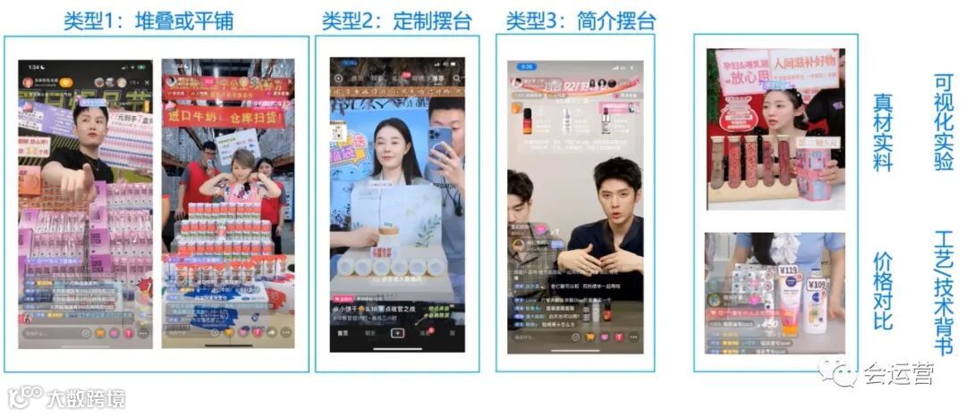 商品讲解主要是主播的讲解方式和商品呈现的场景设计,可以使用下面的几种方式:1)商品堆叠/平铺,2)定制摆台,3)简介摆台等。可视化试验、工艺/技术背书,真材实料,价格对比讲解方式增加商品转化率。