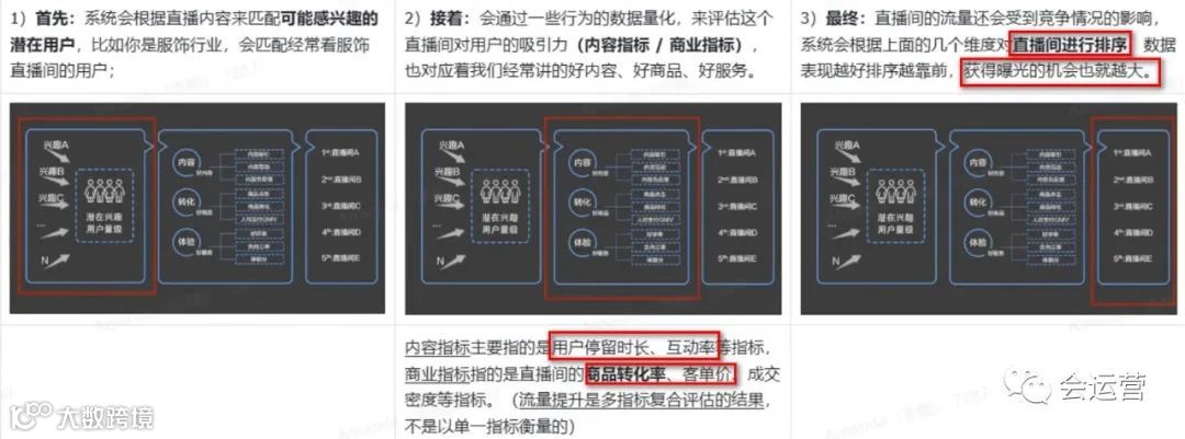 直播间流量分发的逻辑:首先匹配可能感兴趣的用户,然后是通过行为数据(用户停留时长、互动率)和商业数据(商品转化率、客单价、成交密度)判断直播间的吸引力,最后对比多个直播间进行排序数据表现好的就获得更多曝光机会。