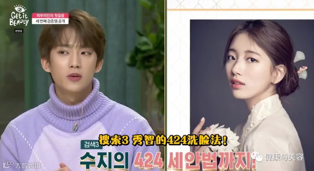 秀智的424洗脸法:先用洁颜油在脸上按摩+乳化4分钟;再用洗面奶进行清洁,约2分钟左右;最后再用4分钟将脸清洗干净。
