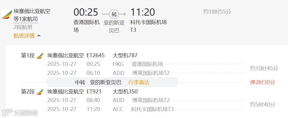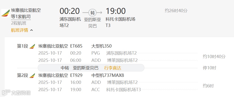方案1:埃塞俄比亚航空(中转地:亚的斯亚贝巴)