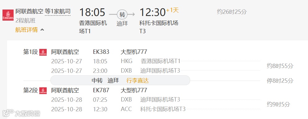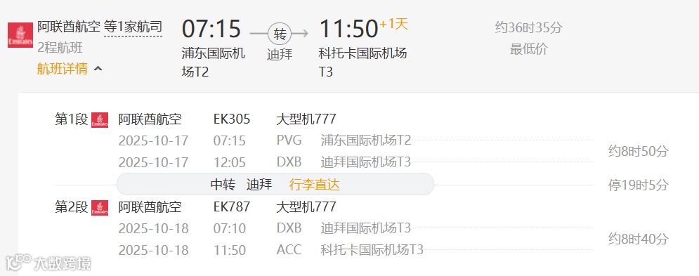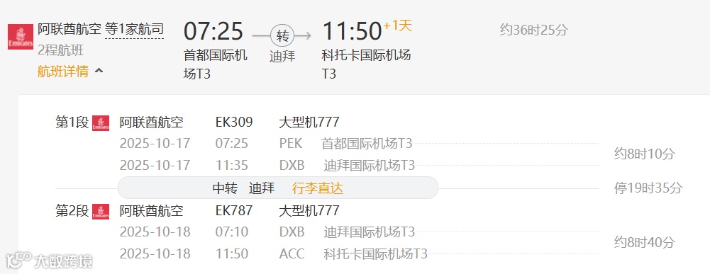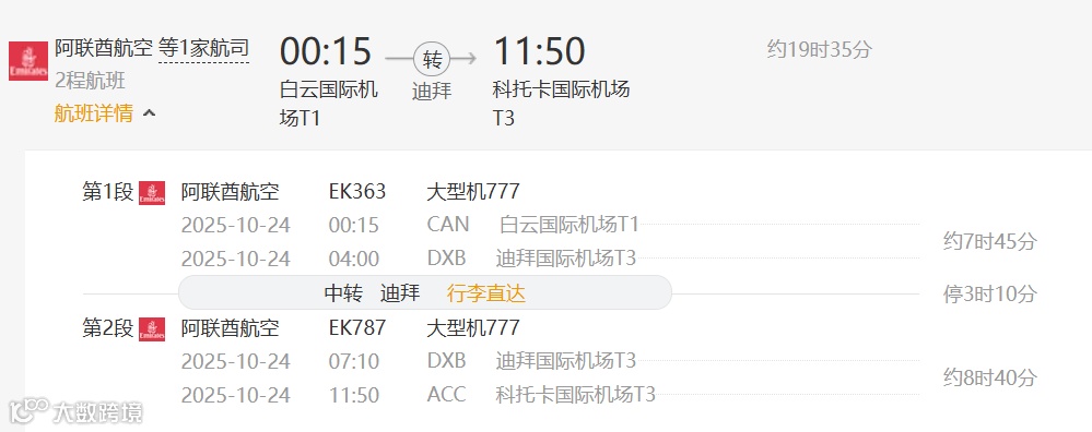 方案2:阿联酋航空(中转地:迪拜)