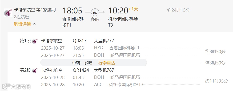 卡塔尔航空QR1423 2025年11月5/6/7日 多哈—阿克拉 09:05 14:35