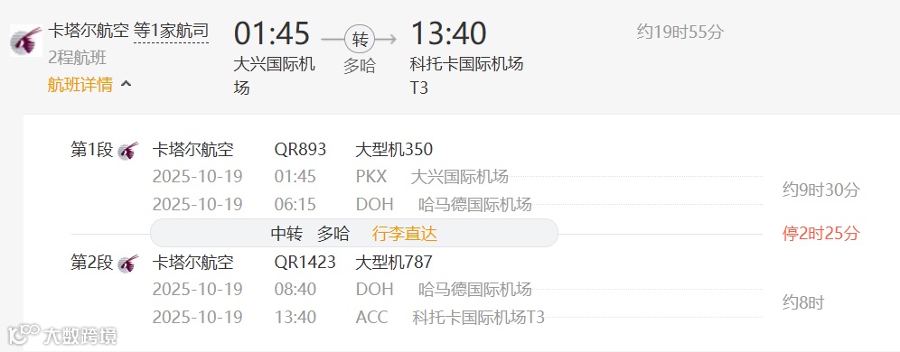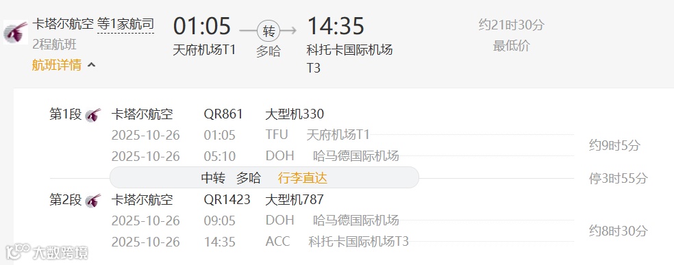 方案4:卡塔尔航空(中转地:多哈)