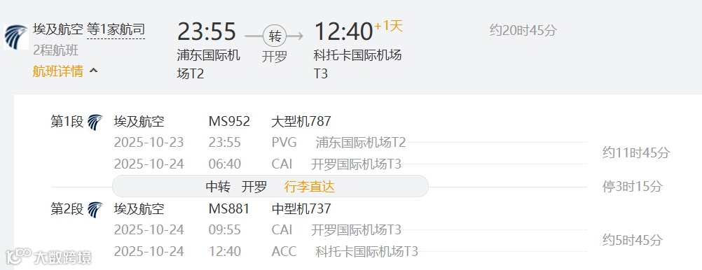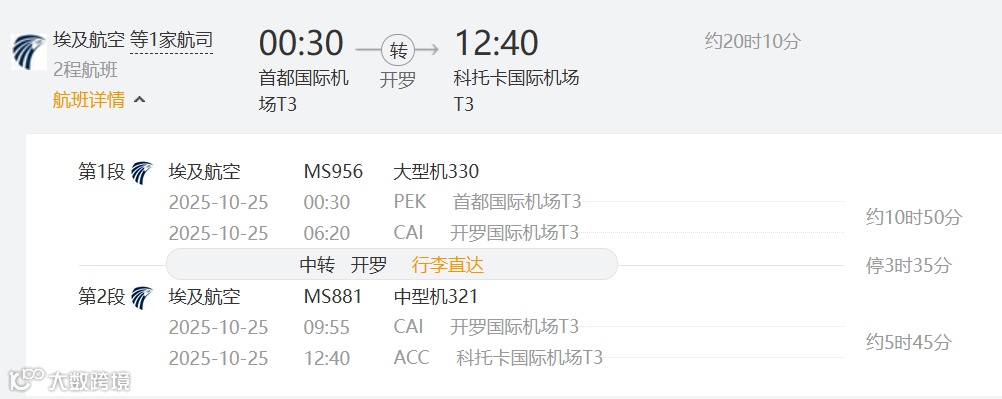 埃及航空 MS881 2025年11月12/14/17/19日 开罗—阿克拉 08:20 12:40