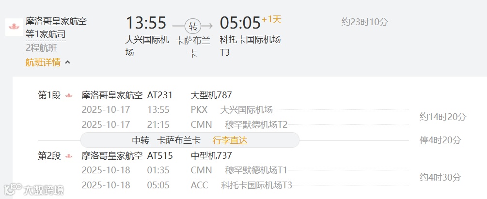 需注意:卡萨布兰卡(CMN)中转需提前确认摩洛哥过境签政策(部分情况需申请电子过境签,费用约50欧元,办理周期3-5个工作日)。
