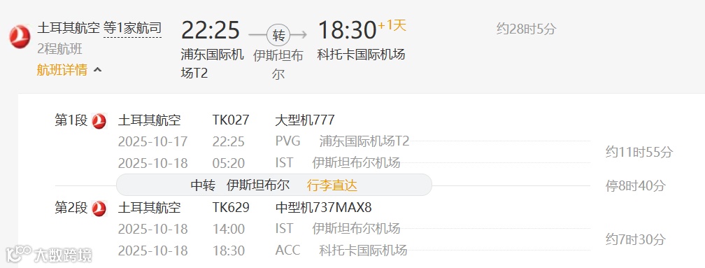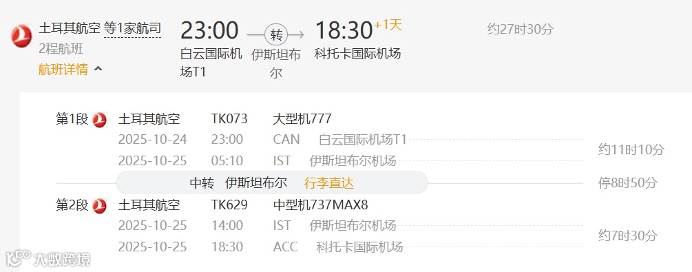 方案6:土耳其航空(中转地:伊斯坦布尔)