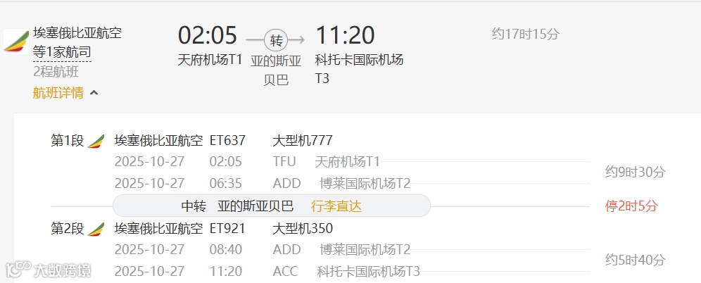 埃塞航空 ET637 2025年11月13/15/17/日 成都天府—亚的斯亚贝巴 02:05 06:35(在亚的斯亚贝巴中转约2小时5分钟)