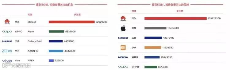 今日头条发布的《2019上半年手机行业白皮书》显示,提到5G时,消费者最关注的品牌中,第一名是华为,第二名是苹果,第三名是三星,其中华为的关注度远高于后几名。然而当关注对象切换到具体机型时,前三名就变成了华为Mate X、OPPO Reno和三星Galaxy Fold。