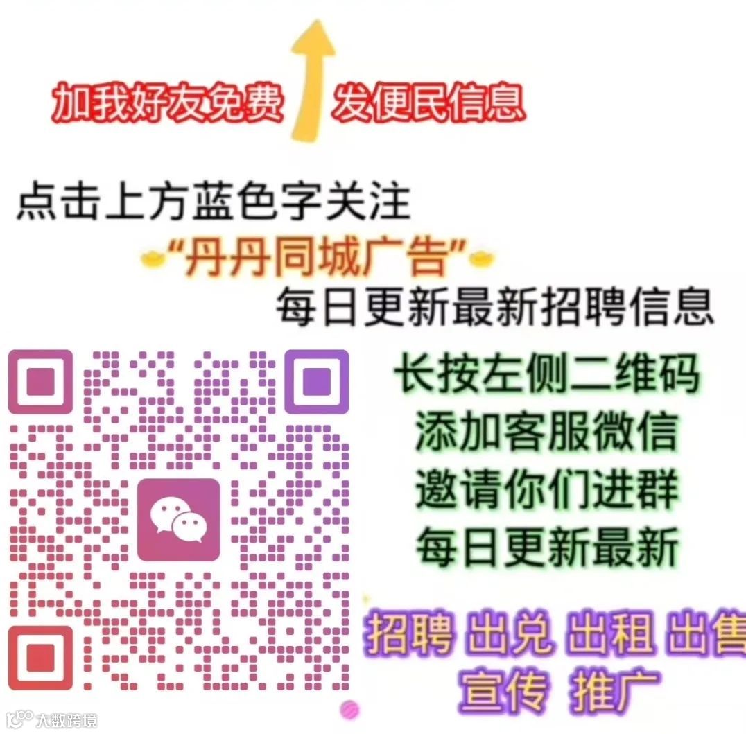 🟢🔴🔵🟡🟣🔴如您需发布招聘出租出兑出售信息等,欢迎添加客服微信。🟥添加客服微信拉你进群,及时查看最新最全招聘出租出兑出售信息。🟥客服微信18043293597,或长按扫描下方二维码添加。🟥所有信息都是网友提供,信息真假还请大家自行辨别,如果发生纠纷与同城信息圈无关。🟥温馨提示:凡是以各种理由未入职先让交钱的,例如:交押金、交保险、交定金等等的均为诈骗!!!