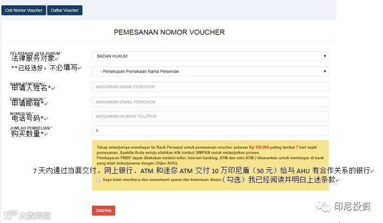 当点击首页的“Pesan Nama”(黄框区域)将出现以下页面,点击红字“di sini”以购买支付券