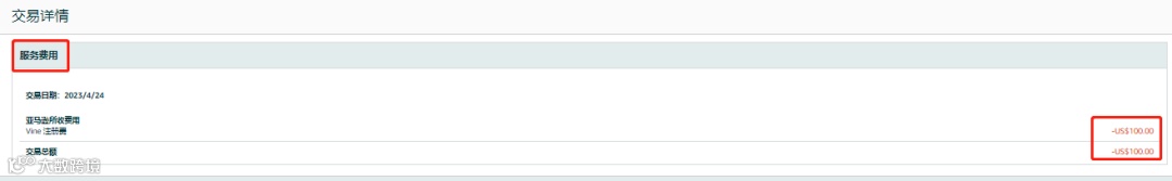 9)交易类型选择服务费用即可看到Vine注册费用(我参加时候亚马逊正在搞活动,因此注册费用为100美金,正常情况下应该是200美金)