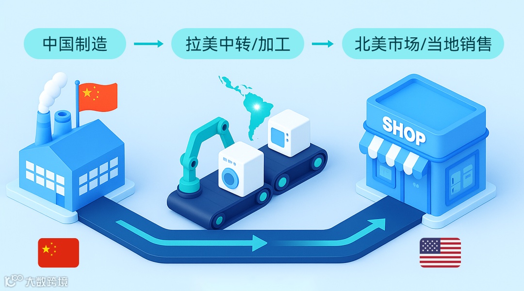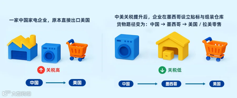一家中国家电企业,原本直接出口美国。中美关税提升后,企业在墨西哥设立贴标与组装仓库。货物路径变为:中国 → 墨西哥 → 美国 / 拉美零售。