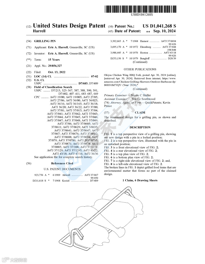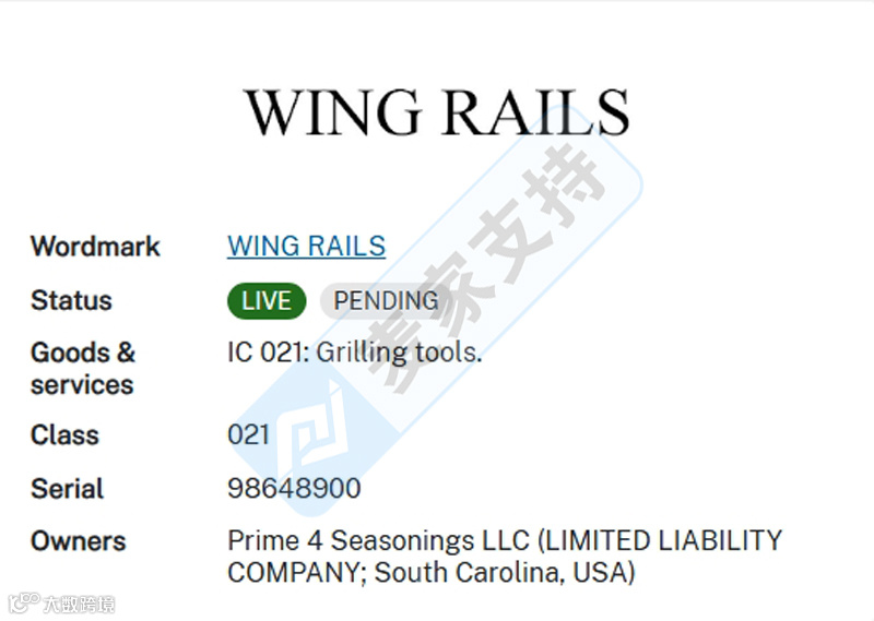 Prime 4 Seasonings, LLC作为一家专注于调味品和烧烤工具的公司,自22年起便注册并获批了6个版权,涵盖4个视频版权和11张图片!此外,该公司还于24年7月向美国商标局申请了Wing Rails商标,虽然目前尚未下证,但其烧烤针的美国外观专利已于24年9月获批,专利号为D1041268。