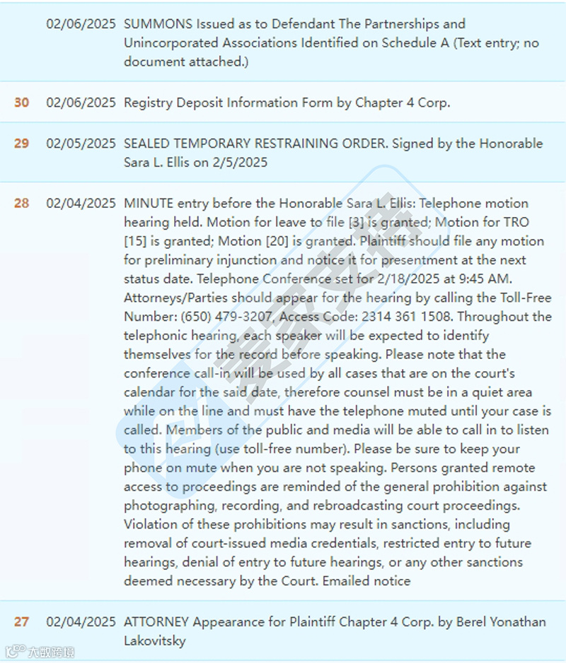 25年商标维权与日俱增,Chapter 4 Corp.也不甘落后,委托GBC律所对其Supreme品牌展开商标保护行动,向对侵犯其商标权益行为的店铺发起强有力的攻击!短短不到10天内,GBC律所已代表Chapter 4 Corp.连续提起了6起TRO维权案件,其中案件号25-cv-00972与25-cv-01321更是迅速获得了法院的签署TRO临时限制令。