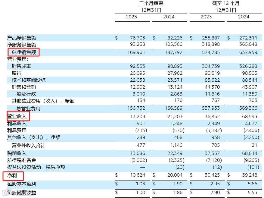 纵观全年,亚马逊营业收入同比增长11%,总额达6380亿美元;营业利润从369亿美元攀升至686亿美元,净利润高达592亿美元。