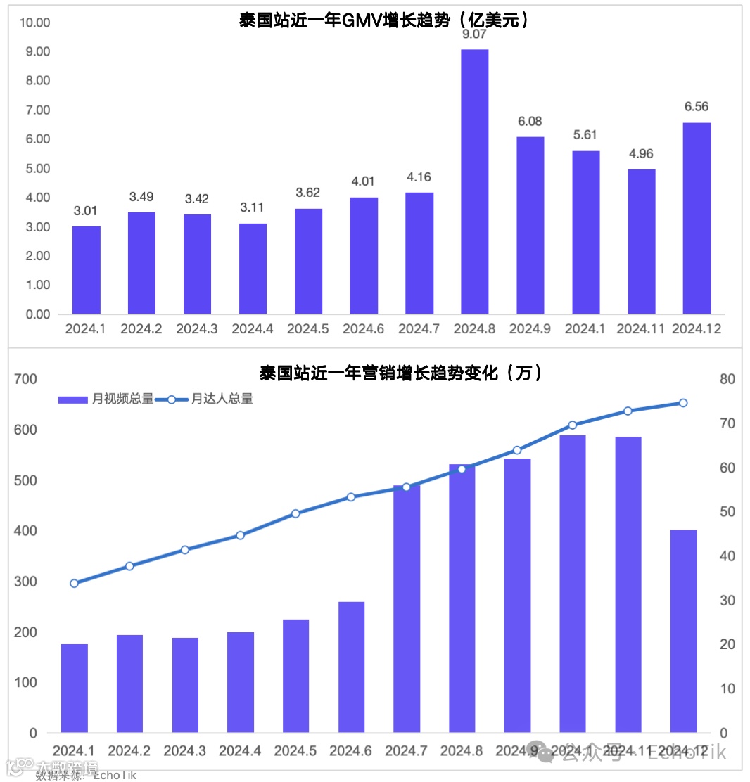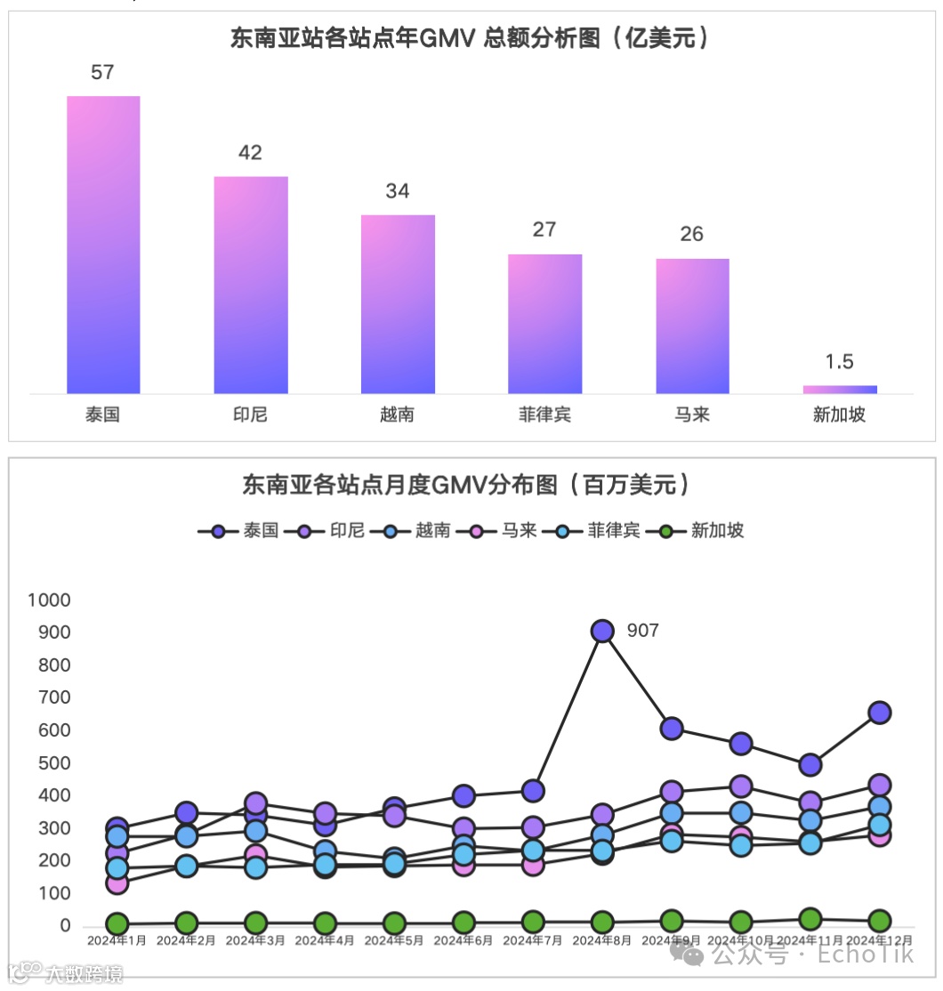 2024年,泰国市场GMV达57亿美元,月均4.75亿美元,为东南亚最高站点,同比增长11.3%。自1月3.01亿美元增长至9月9.07亿美元,受8月平台营销策略推动,下半年增速高于上半年,市场潜力显著[k]。
