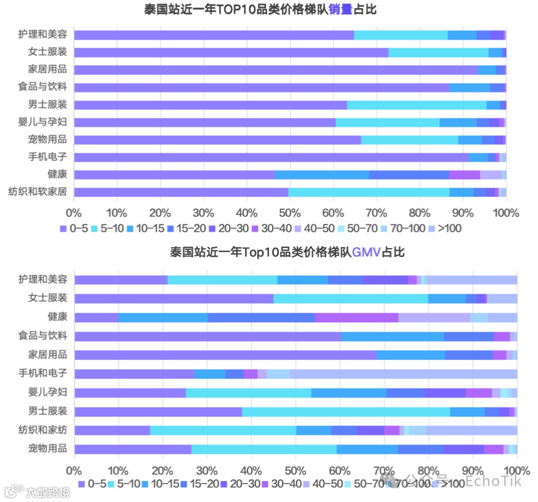 泰国市场5美元以下商品销量占比极高,家居用品、手机电子及食品饮料均超过90%。5-10美元商品次之,10美元以下商品出单量约4.3亿件,占总销量近90%,体现其以低价走量为核心特征[k]。