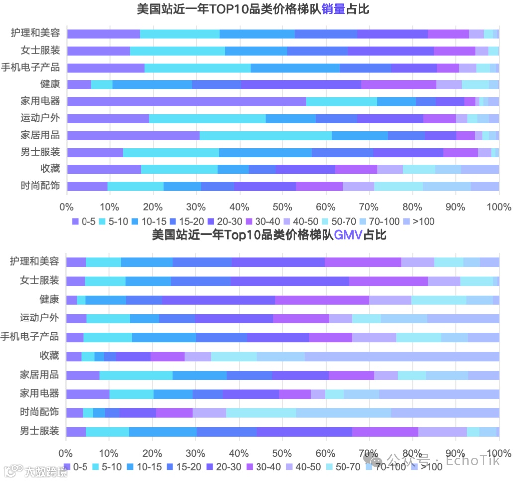 美国市场GMV主要来自20-40美元价格段,其中20-30美元占比约20%,30-40美元约15%。护理美容、女士服装、健康及运动户外等品类集中于20-30美元区间。5美元以下低价商品GMV占比仅5%,而收藏品类中100美元以上产品占比超40%,时尚配饰与家用电器在百美元以上区间占比亦近30%,体现美国市场对高价值商品的接受度较高[k]。