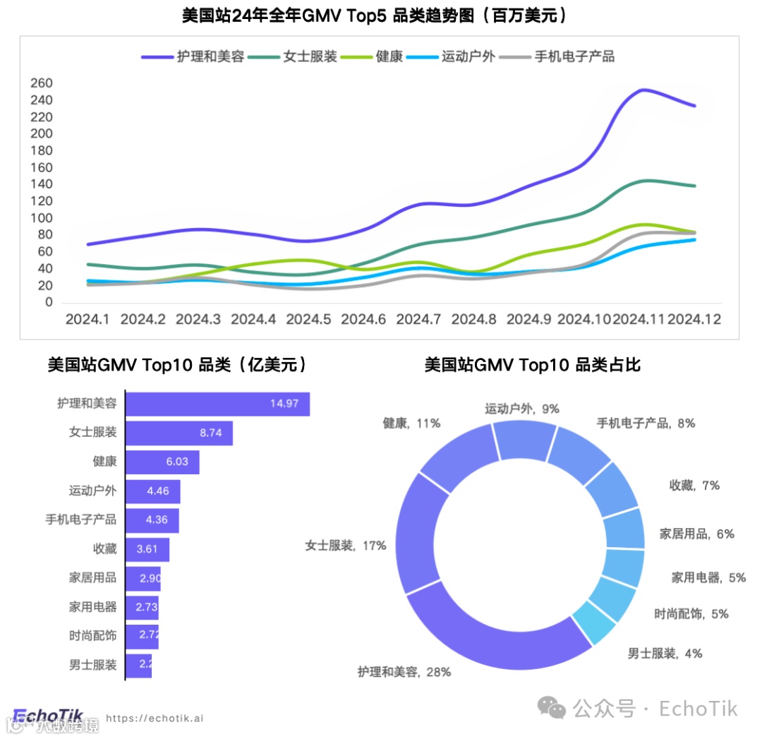 2024年美国市场头部品类波动增长,护理及美容全年领跑,12月GMV达2.33亿美元。TOP2至TOP5品类排名稳定,增长态势良好[k]。