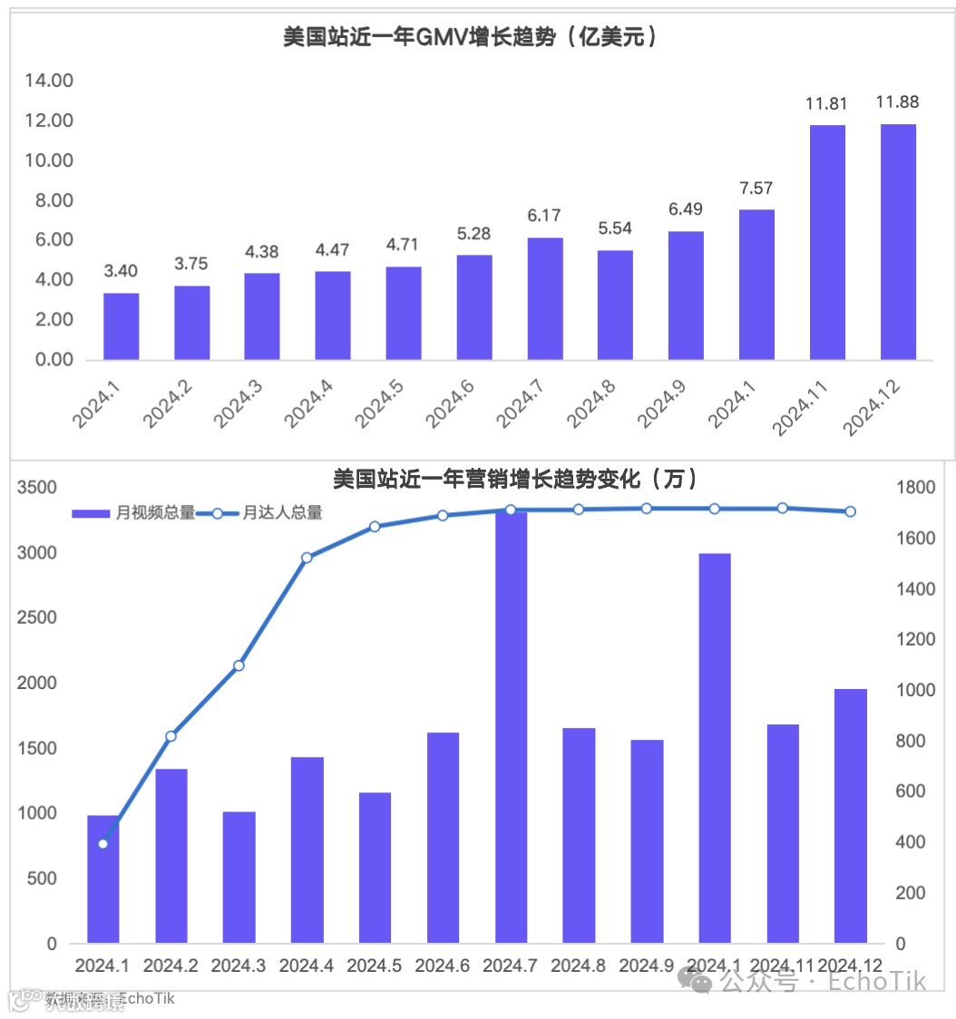 2024年,TikTok Shop在多个国家实现显著增长,泰国与美国市场表现尤为突出。泰国GMV从年初3亿增长至6.56亿美元,年末增幅显著,凸显其在东南亚市场的吸引力。美国市场则从3.39亿美元增长至11.88亿美元,全年接近三倍增长,商业化潜力持续释放[k]。