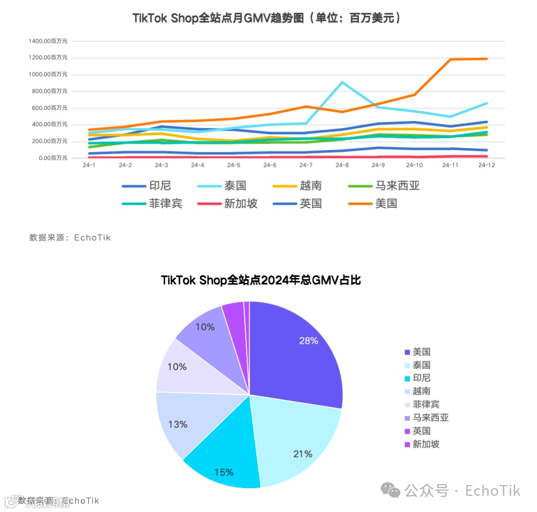 据EchoTik数据显示,2024年TikTok Shop全球商品交易总额(GMV)突破273亿美元,其中美国市场占比接近三成,成为平台全球增长的核心引擎[k]。
