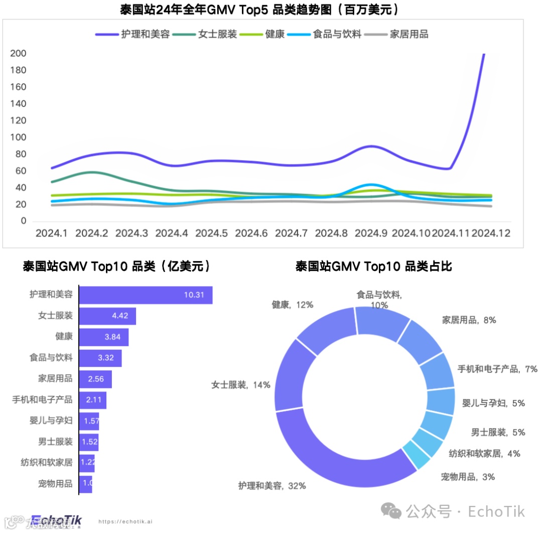 泰国TOP10品类累计GMV达31.8亿美元,占总GMV的56%。护理及美容因需求旺盛及KOL营销高效,占据榜首,贡献TOP10总量的三分之一。女士服装累计GMV近4.4亿美元,受益于季节性需求与平台购物便利;健康品类以约3.8亿美元位列第三。前三品类合计占比近六成,市场集中度较高[k]。