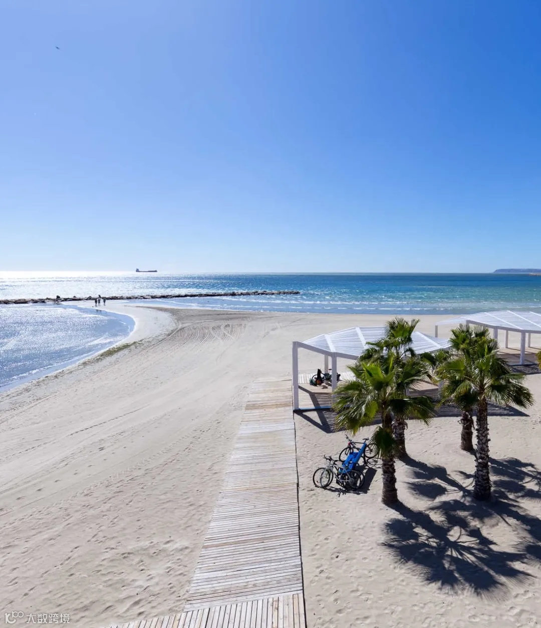 走着走着就来到波斯提哥特海滩(Playa del Postiguet),这片长约1公里的海滩多年来一直荣获欧盟颁发的蓝旗海滩称号,常年游人如织,设有沙滩排球、沙滩足球,以及足浴、日光浴床和脚踏船等设施,并配备了周到的无障碍服务,所有人都可以悠闲地在此享受。