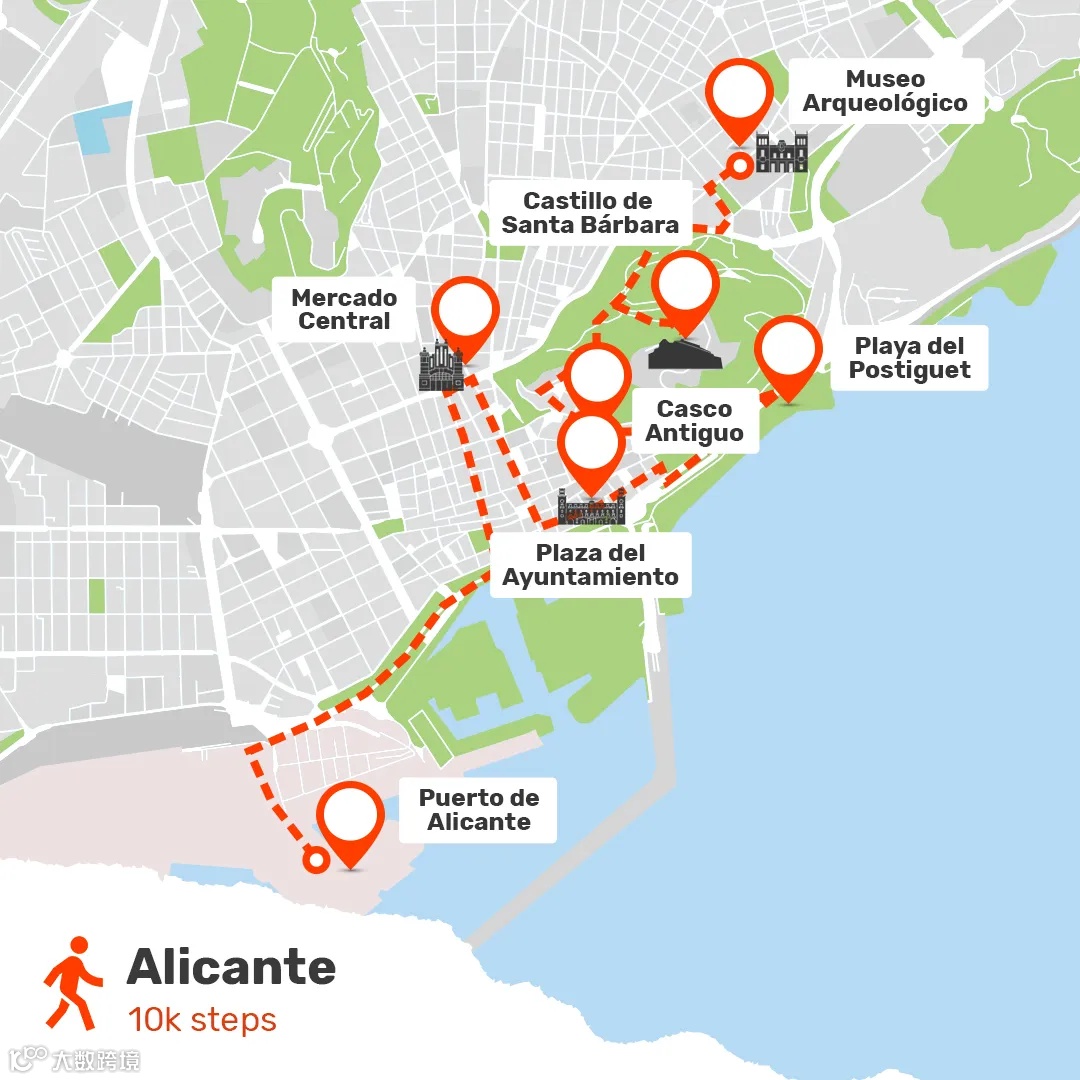 万步打卡路线:波斯提哥特海滩(Playa del Postiguet)——圣巴巴拉城堡(Castillo de Santa Bárbara)——阿利坎特考古博物馆(Museo Arqueológico Provincial de Alicante,MARQ)——中央市场(Mercado Central)——老城区(El Casco Antiguo)——市政广场(Plaza del Ayuntamiento)——阿利坎特港口(Puerto de Alicante)