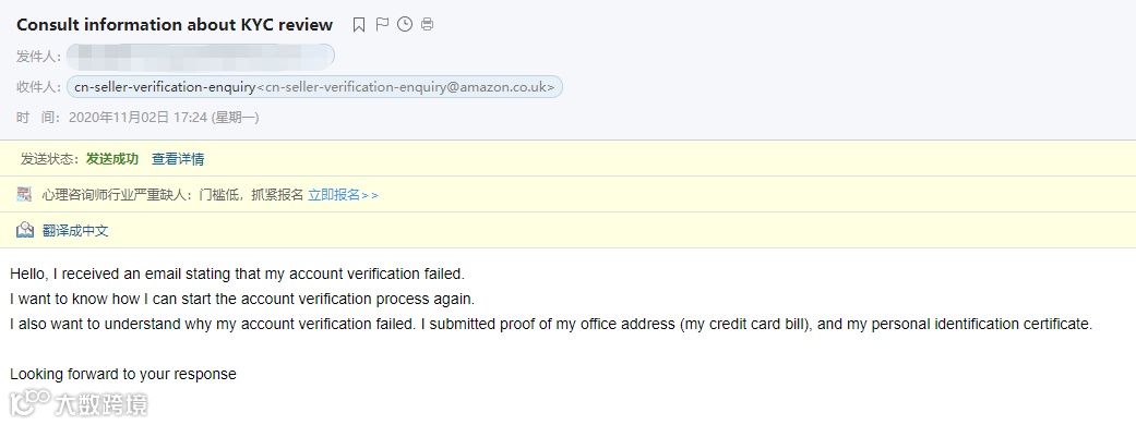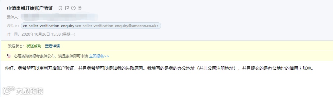 2.发邮件咨询情况,例如咨询失败原因以及如何重新开启相关审核