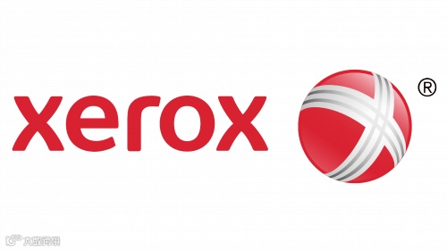 Xerox 标志以红色球体与白色“X”为主,彰显专业性。