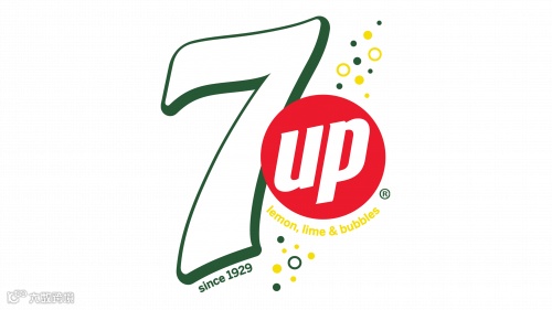 7 Up 标志由绿、黄、红三色圆圈构成,分别代表柠檬酸橙味与气泡特质,红色圆圈传递活力与激情。