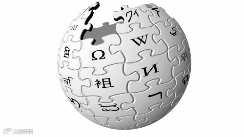 维基百科标志以白色拼图组成三维球体,寓意全球知识共享。