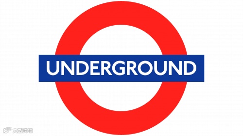 London Underground 标志以红色圆环与蓝色矩形构成,简单直观。